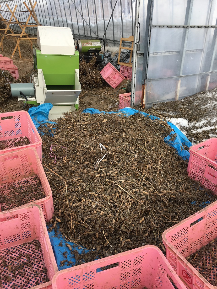 10月末に乾燥するためにハウス内にはさ掛けしたらっかせい……。