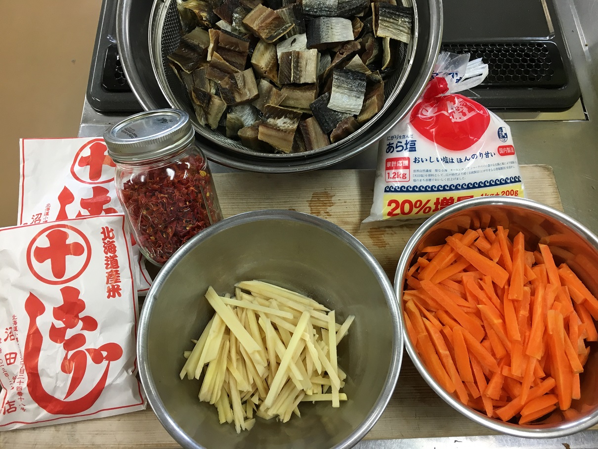 糀、身欠きにしん、塩、にんじん、しょうが、鷹の爪です。