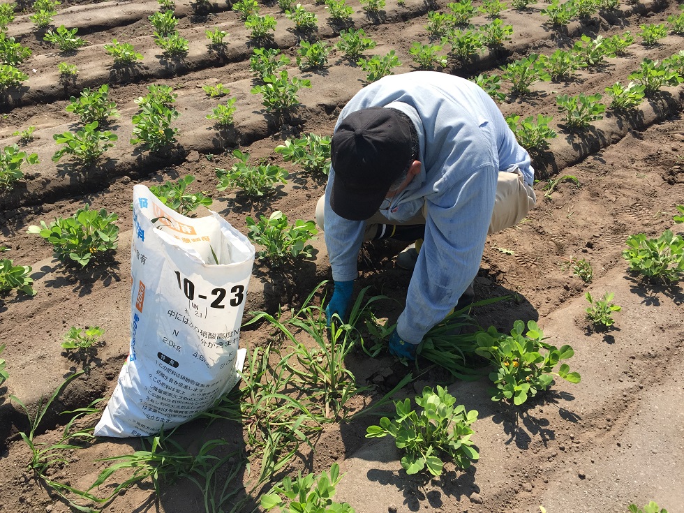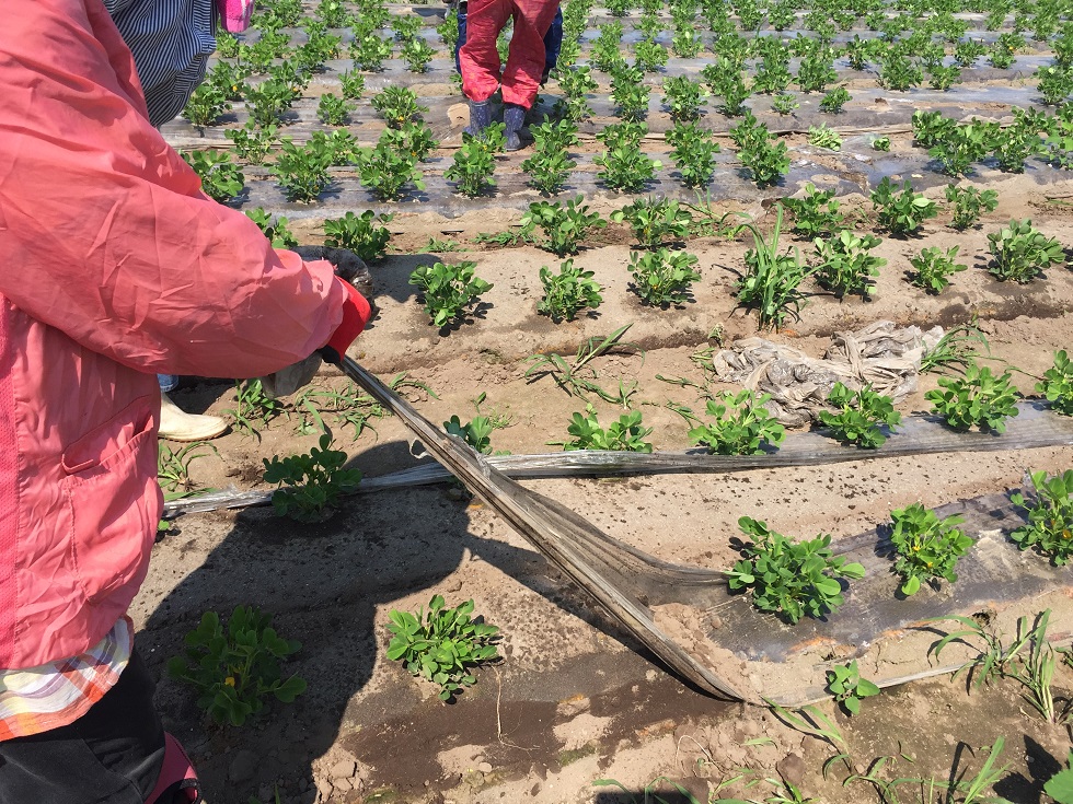 これから子房柄が土にささっていくため、マルチをはがします。
