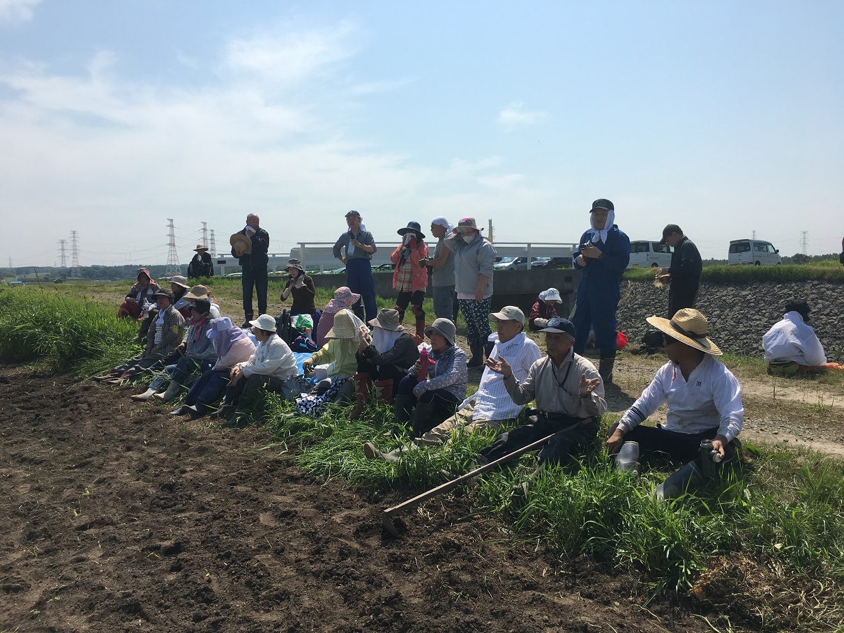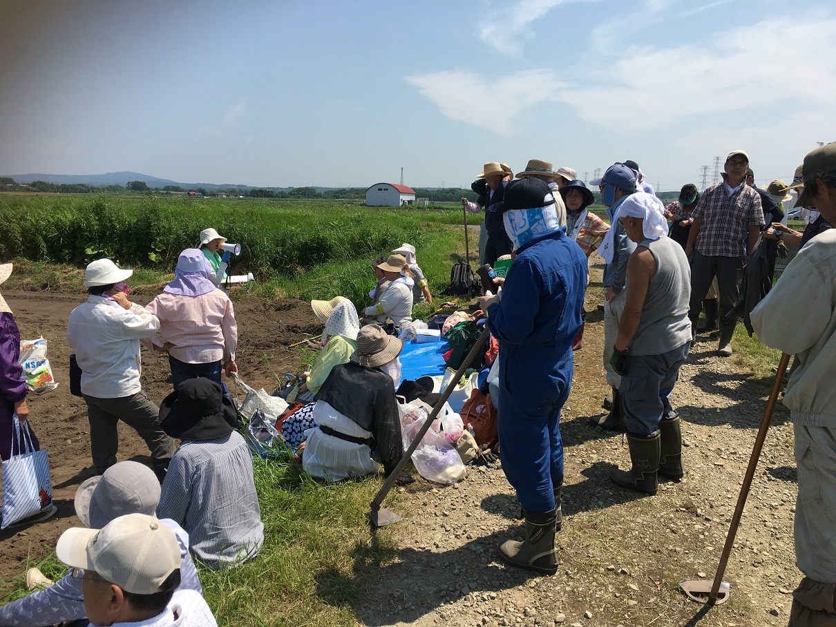 鎌などを持っている人がマルチに切れ目を入れ、そのほかの人達でマルチをはがしていきます。