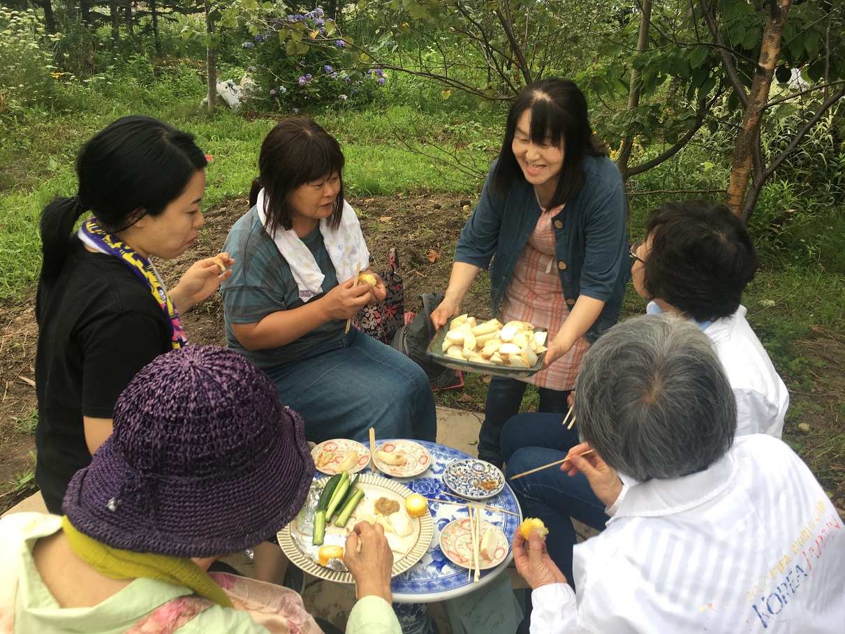 会員の皆さんが草取りを終える前に、応援隊の面々は交流会会場に移動しました。