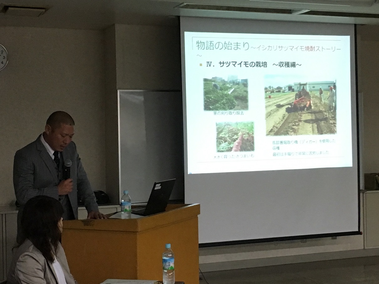続いて、JAいしかり青年部長の増田さんによる、サツマイモ焼酎『芋男氣(いもだんぎ)』の取組を、