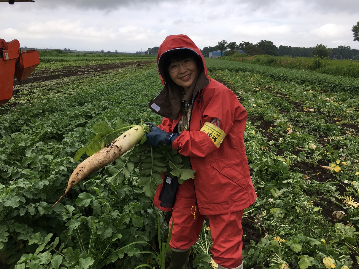 今らっかせいを植えている畑の向かいでは大根が収穫時期を迎えています。