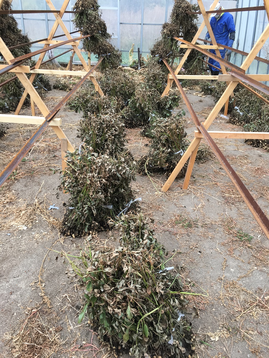 束ねたらっかせいをハウスに運び、逆さに「はさ掛け」していきます。